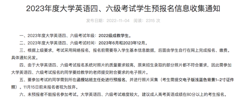 6、2023年下半年全国英语六级考试时间11月21日至22日口语12月12日笔试,报名在9月份左右开始,口语考试从8点30正式开考,笔试从下午3点正式开考英语四六级2023下半年报名时间 2023年下半年英语四六级考试报名。