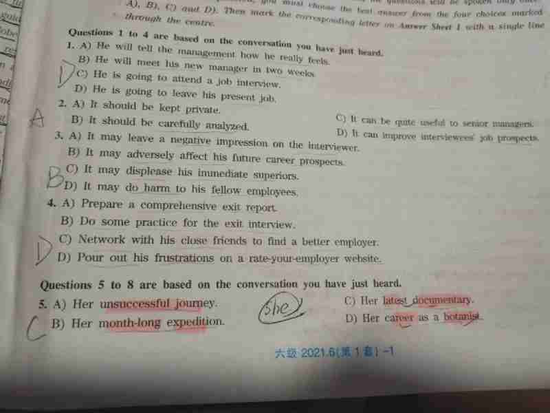 5、英语六级听力理解有三个类型题,分别是长对话听力篇章讲座或者报道,听力播放时长是三十分钟分值比例为35%,其中长对话占8%,共8道题,每题71分听力篇章占7%,共7道题,每题71分讲座或者报道占20%,共。