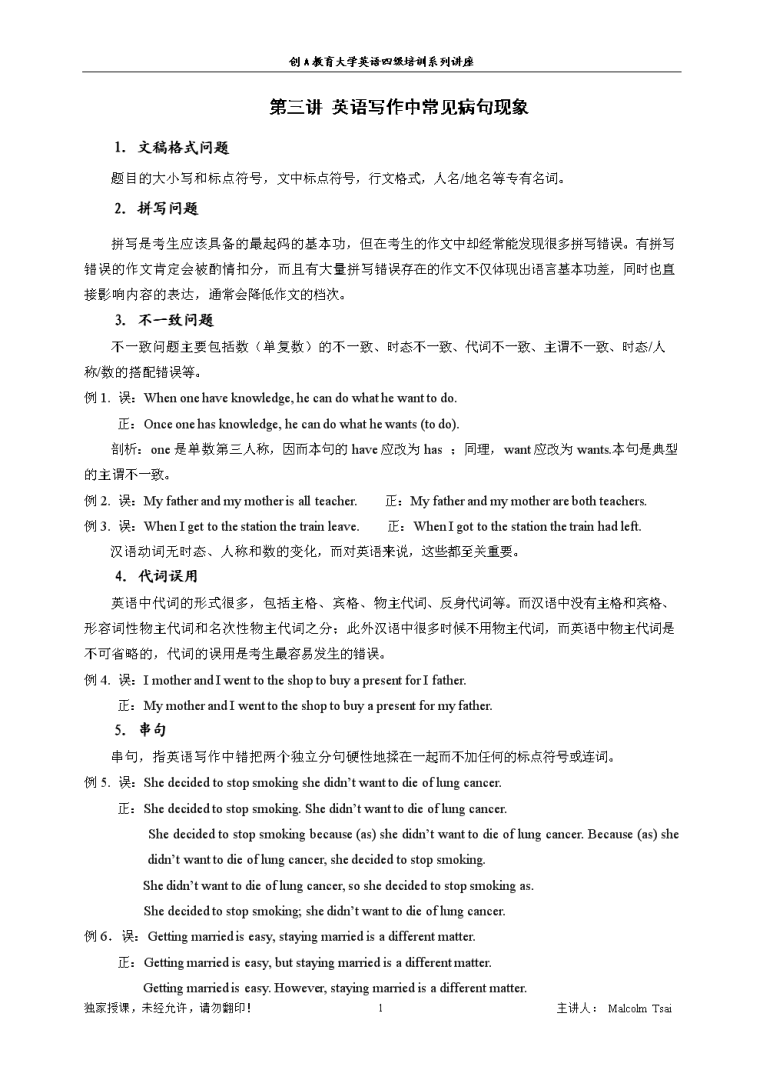 写作是对学生运用英语的综合能力的考查,是最能体现学生英语水平的一种检测方式。学生在写作的过程当中经常暴露一些弱点、犯一些错误。现对学生英语作文中的常见错误按语法类别进行归纳,并举以实例,希望同学们能够由此发现自己的问题并及时改正!