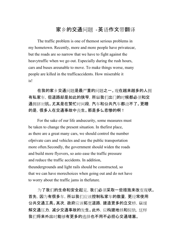 The Lunar New Year The Lunar New Year is a great occasion to the Chinese people It lasts about the first four days of the year, during which people do not work except for the workers on duty Student;译文我爱我的妈妈我的妈妈是个好女人她对我很好她每天给我一个好的早餐当我去上课,她去工作每一个夜晚,她和我去我的房间她说“晚上好“晚上好”“我说然后她去了她的房间我爱我的妈妈;When I first came to school, I was short and fat最初来到学校的时候,我又矮又胖At that time, I was addicted to online games and spent most of my time playing computer games那时,我沉迷于网络游戏;初中英语作文带翻译范文一道路安全 Road Safety Nowadays, there are many people dying because of traffic accidents Road safety has aroused much attention Many rules are made to reduce this kind of accidents。