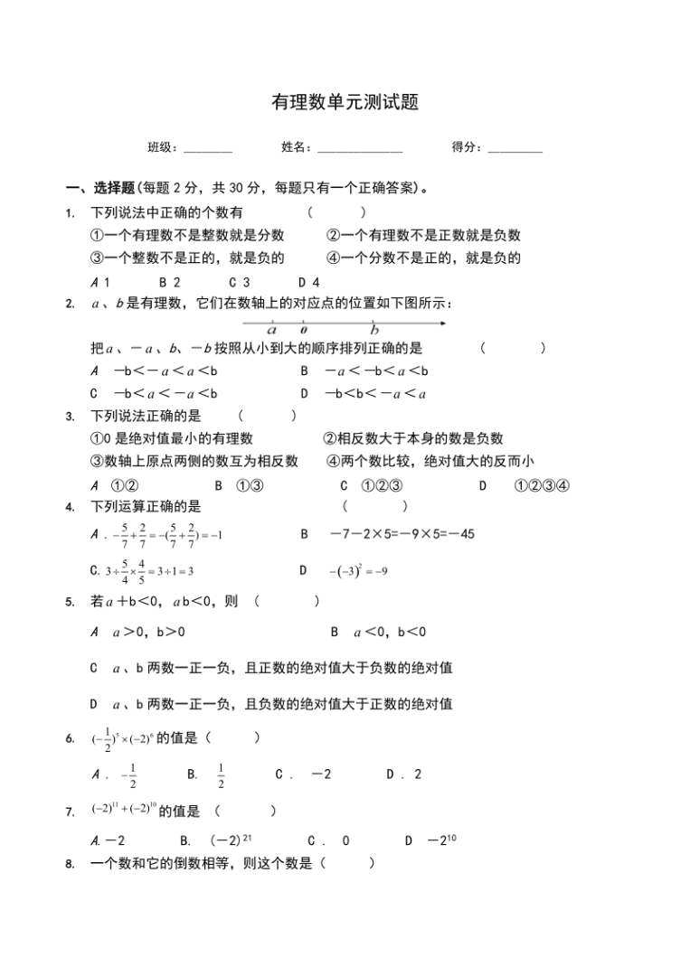 1、初一数学测试题 时间120分钟 满分120分姓名___ 分数___一填空题每小题3分,共30分1数3,12,06,41,127%,03,10,117,负数有___,分数有___2大于6的负整数是___。