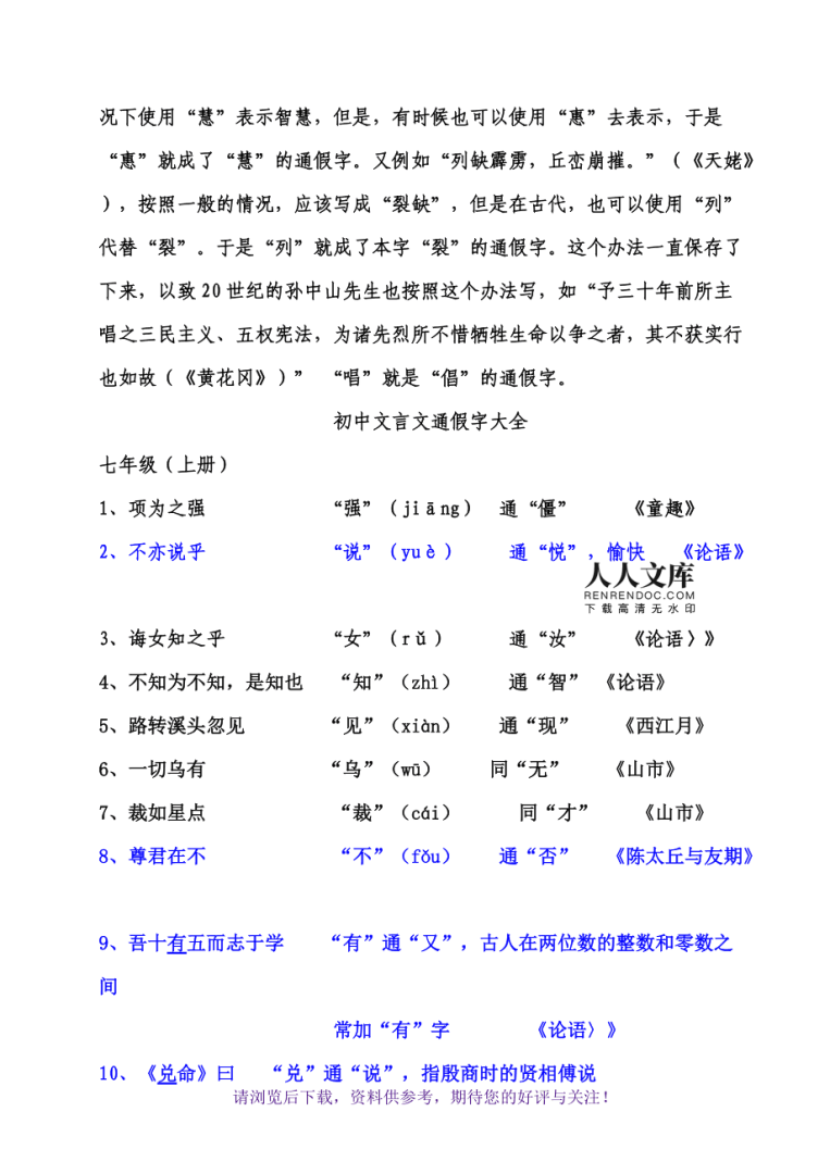 常用通假字 七年级上 1昂首观之,向为之强 强,通“僵”,僵硬的意思童趣 2子曰“学而时习之,不亦说乎?”说,通“悦”,愉快,高兴论语十则 3诲女知之乎? 女,通“汝”,人称代词,你论语十则 4既。