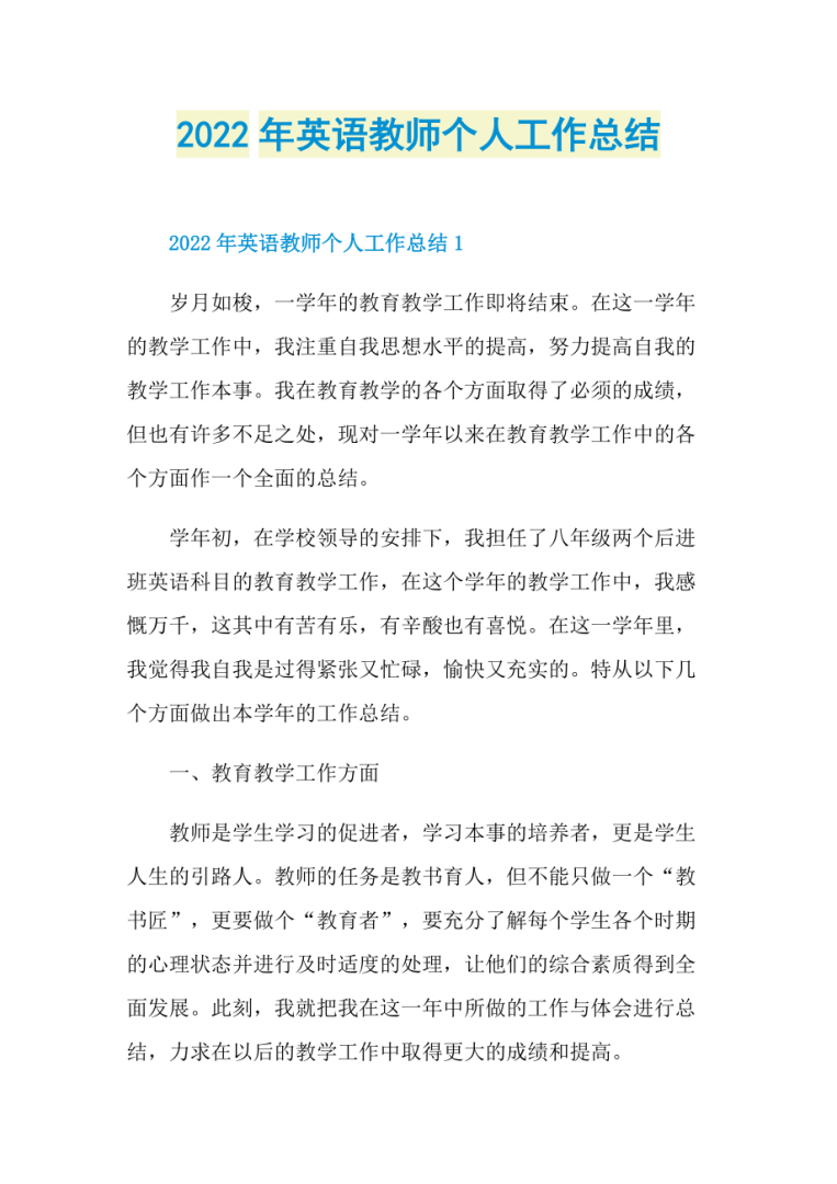 2022年初一英语教师教学工作总结1 #x2003#x2003本学年以来,自己一如既往地担任初中英语教学工作,认真负责地完成教育教学任务,积极履行自己的职责为人师表,按照教育教学规律培养学生,积极引导学生关心时事,关心社会,自觉实施素质教育,取得了很好。