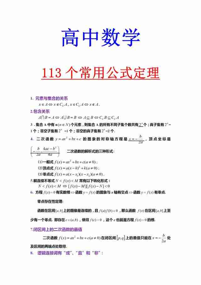 #高三# 导语高中数学是一门比较占分的科目,有繁多的公式和数值,让很多的同学感到头疼下面 为大家整理的高中数学各知识点公式定理记忆口诀归纳,仅供大家参考集合与函数 内容子交并补集,还有幂指对函数。