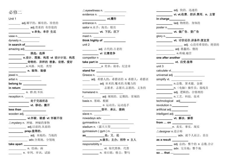 下面给大家带来一些关于人教版高中 英语单词 表必修二,希望对大家有所帮助 unit1 cultral 文化 的 relic遗物,遗迹,纪念品 rare稀罕的,珍贵的 valuable贵重的,有价值的 survive幸免,幸存 vase花瓶 dynasty朝代 TajMahal 泰姬陵 ivory。