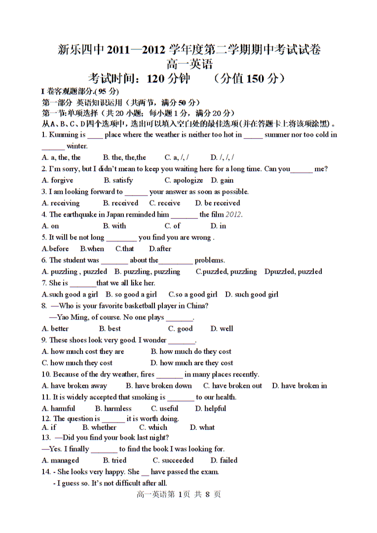 主要题型有语法填空,完形填空,阅读理解,词语填空,写作;有了良好的阅读技能,学生不仅能在做完形填空时游刃有余,而且还能从整体上提高英语考试的成绩 高一英语完形填空解题秘诀 一 阅读技能与试题设计 2003年颁布的普通高中英语课程标准实验明确提出“高中阶段要着重提高学生用英语获取。
