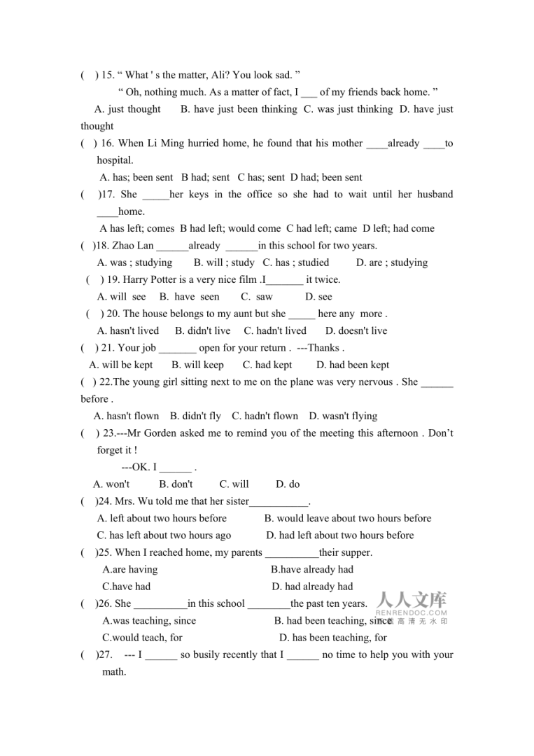 5、第二题因为整句话都是过去式,所以谓语动词也用过去式,A与C选C过去完成进行式是强调过去发生的一直持续到现在且现在还在进行一直到以后的,这里显然没这种意思,所以选A 第三题delight sb不需要用被动,所以 C 与 D选因为long表示已经持续了一段时间了,所以用完成时。