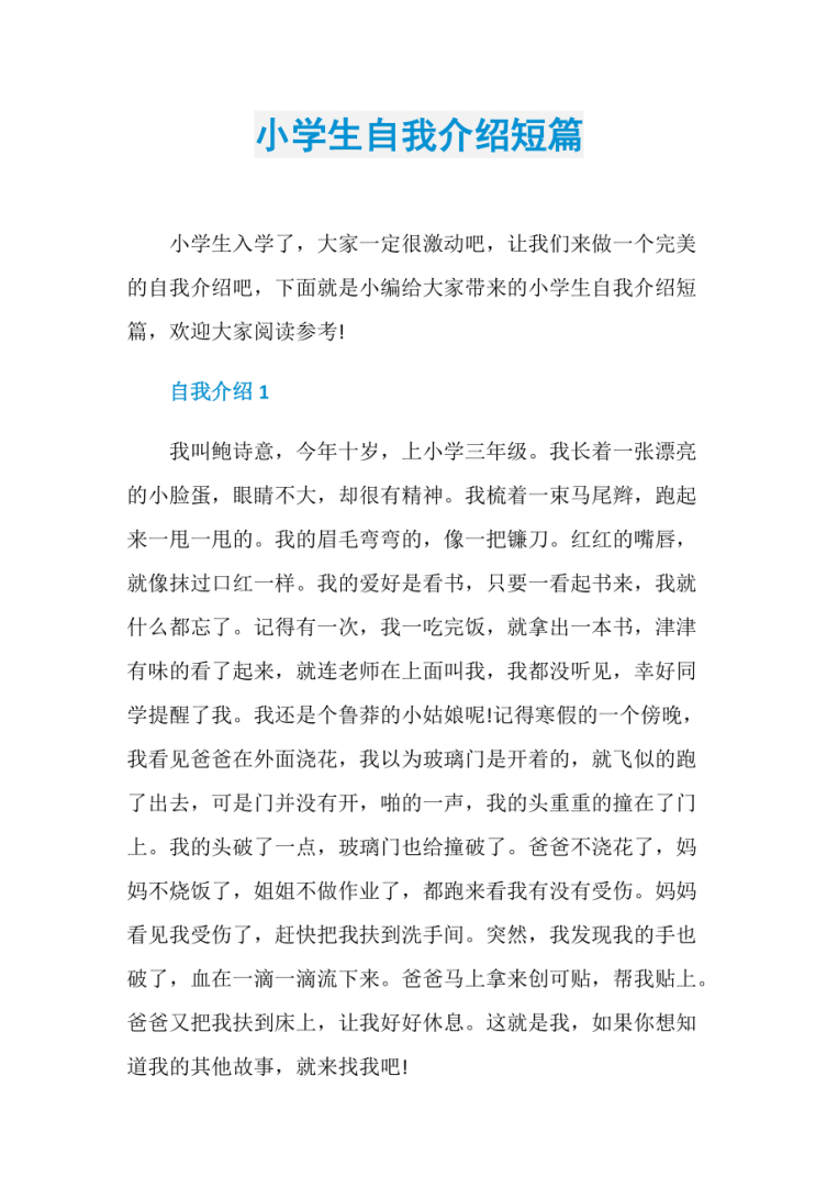简短的自我介绍学生1 我叫~~~,就读于章丘市实验小学六年级一班 我是班中的一名普普通通的女孩我的脸型胖乎乎的,像是一个大苹果我每天都想减肥,可是老妈总是阻止我 我的 爱好 很单一,我就喜欢玩我觉的玩是一件很开心。