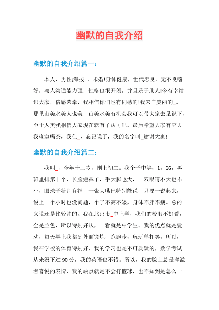 13、自我介绍第3篇各位同学,别来无恙!鄙人姓高,单名一个爽字,字良川,号沧溟,江苏盐城人这是我第二次被选为班级之星说实话,这两次当选,我真的不知道为什么选我,这不是谦虚,是实话比我优秀的人很多啊但。