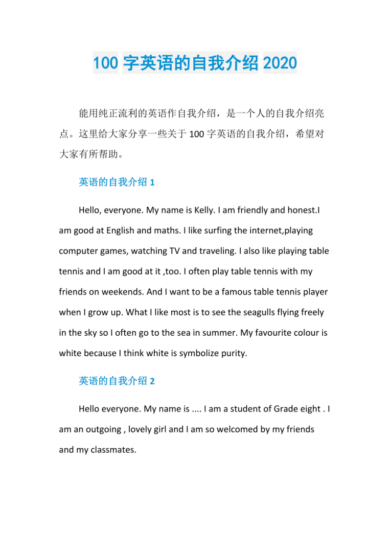 2、58句英语自我介绍范文一 Hello,everyone!I want to make friends with youHow about you?First,let me introduce myself to youI have two namesOne of them is my Chinese name,the other is my English。