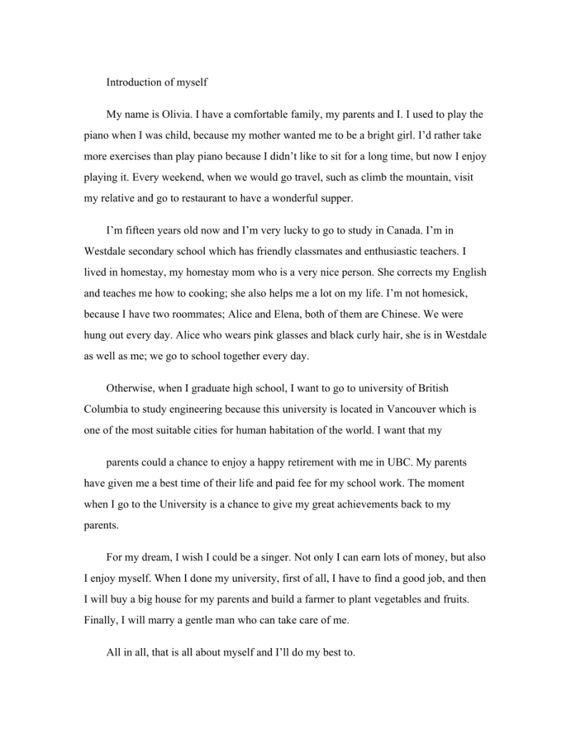 Hello everyone,Allow me to introduce myself My name is Your Name I am your age years old and I come from your city or country I am currently a your gradeyear in schoolIn terms of my personality, I am an outgoing and friendly person I enjoy meeting new。