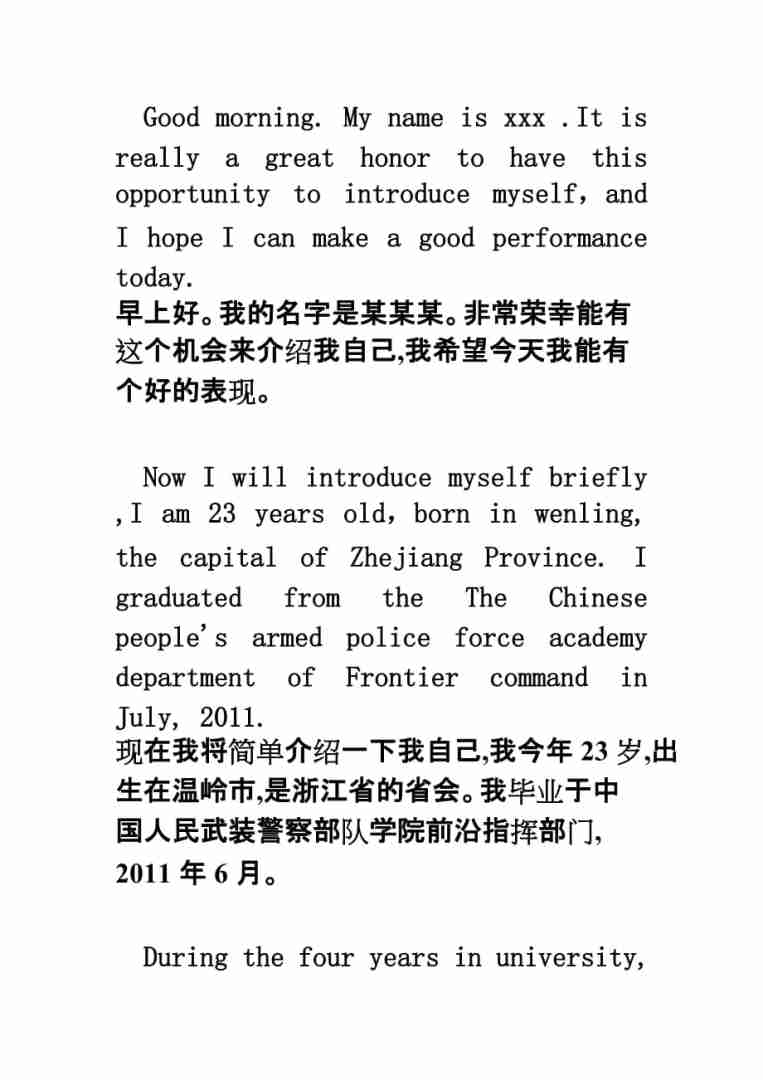 篇一自我介绍 Selfintroduction Good morning, my admirable teacher and my dear fellows My name is Qing Cheng and I’m in my 17 years old I graduated from theTianTaoMiddle school, which is one of the。