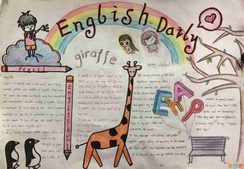 手抄报是一种可传阅可观赏也可张贴的报纸的另一种形式下面我为大家带来英语手抄报,仅供参考,希望能够帮到大家小学英语教学反思范文 一在中国,英语是外语,不是二语,不可习得在中国,很多人忽视了英语是一;三年级下册英语手抄报画法如下1首先在手抄报中画四个边框,在左边画上一个云朵边框和一个方形边框2接着在手抄报的左下角画上三位正在读书的小朋友3然后在外围画上一圈边框,在边框的周围画上云朵和字母装饰;导读在现今时代,学好英语还是很有必要的,这能决定了你以后出国能有好的交流,以后升职加薪的一个跳板,还有提升自己的语言能力学习英语可以用手抄报的形式来刺激学生们的兴趣爱好,以下是我带来的英语手抄报图片大全简单;1写出英语标题,如下图所示2在右边画一个娃娃,如下图所示3再画出简单分界线,如下图所示4画出灯笼,如下图所示5用黑笔描边,擦去铅笔痕迹,如下图所示6填涂颜色即可,如下图所示手抄报;1首先我们要在手抄报内添加太阳彩虹叶子以及英文字母的图案,然后沿着手抄报的边缘画上一个边框2在波浪形边框内左下角空白的地方画上一个圆形的文字框,然后写下英文,例如我爱英语3在“我爱英语”字样上方。