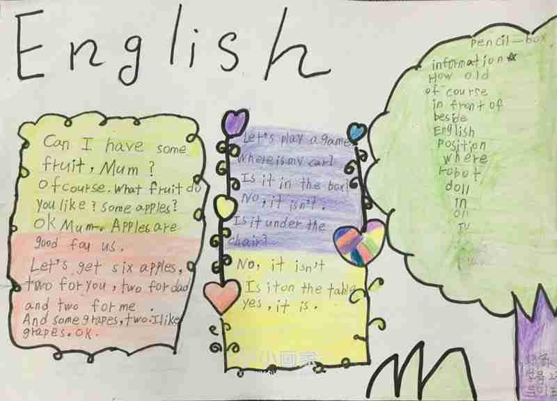 2、but it gives me much happiness 我有一间小小的卧室那里有一张小小的床小小桌子和一把小小的椅子而且还有一个漂亮的娃娃在我那张蓝色的小床上我每天都在房间里写作业,看书和与我的娃娃玩虽然房间很小,但是他;下面是由整理的三年级英语手抄报内容,希望对您有用!三年级英语手抄报一 There is a park near my homeThere are a lot of beautiful trees,flowers and birds in the parkSo many people go to the park;6在三个不同形状的文字框内用尺子画上间距相等的横线或竖线,这样一幅好看的英语手抄报就画完了手抄报,是指新闻事业发展过程中出现的一种以纸为载体以手抄形式发布新闻信息的报纸,是报纸的原形,又称手抄新闻;三年级下册英语手抄报简单又漂亮的画法如下1首先在手抄报的左上角画上一个书本形状的边框,在右上角写上“English”,边框右下方写上主题,并画上花边2接着在主题的右上方画上太阳,并在手抄报的底部画上一个长方形。