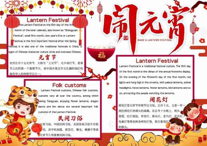 英语元宵节手抄报 农历正月十五元宵节,又称为“上元节”,上元佳节,是中国汉族和部分兄弟民族的#39传统节日之一,亦是汉字文化圈的地区和海外华人的传统节日之一以下是英语元宵节手抄报,欢迎阅读 英语元宵节手抄报1 英语元宵节手抄报2 英语元宵节手抄报3 英语元宵节手抄报4 英语元宵节手抄报5 英语元宵节手抄报6;元宵节英语手抄报内容 篇1 Eating Yuanxiao 元宵节习俗 吃元宵 Yuanxiao is the special food for the Lantern Festival It is believed that Yuanxiao is named after a palace maid, Yuanxiao, of Emperor Wu Di of the Han Dynasty Yuanxiao is a kind of sweet dumpling, which is;元宵节手抄报英语内容节日由来 The Lantern Festival falls on the 15th day of the 1st lunar month, usually in February or March in the Gregorian calendar As early as the Western Han Dynasty, it had become a festival with great significance This day#39s important activity is;关于元宵节的英语手抄报内容如下1月上柳梢头,花灯溢彩流人潮熙来往,指点玉琼楼圆月当空挂,思念垂几愁?愿君共婵娟,福泽长千秋恭祝元宵节快乐!month onliushao head,excessive flowlanterns crowds city, jade joan tower full moon washanging,missing hang a few sorrow? let all;CCTV will held the grand Spring Festival gala译文中国的春节庆祝冬天的结束和温暖春天的来临它开始于农历年的最后一天,结束于农历正月十五,也就是元宵节在春节期间,人们用红灯笼和春联装饰房子,穿上各式各样的彩色衣服,经常拜访亲戚朋友或聚在一起吃饺子鱼肉和其他美味的食物孩子们;元宵节手抄报内容英语 从小学初中高中到大学乃至工作,大家总免不了要接触或使用手抄报吧,手抄报对全面落实素质教育,培养具有创新意识创造精神的人才具有很重要的意义你知道什么样的手抄报才能算得上是好的手抄报吗下面是我精心整理的元宵节手抄报内容英语,希望对大家有所帮助与元宵节有关。