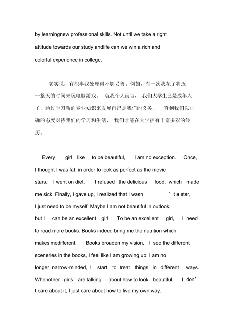关于每日英语短文篇一 In the traditional view, when girls get married, they should quit their jobs and be the housewife, taking care of every housework But in the modern society, some girls no longer accep;随着世界各国间经济贸易商业往来日益频繁,经济全球化的发展迅速,国家对于专业型英语人才的需要也日益加强我精心收集了优美英语小短文带翻译,供大家欣赏学习!优美英语小短文带翻译篇1 坚持下去的理由Reason to Keep Going。