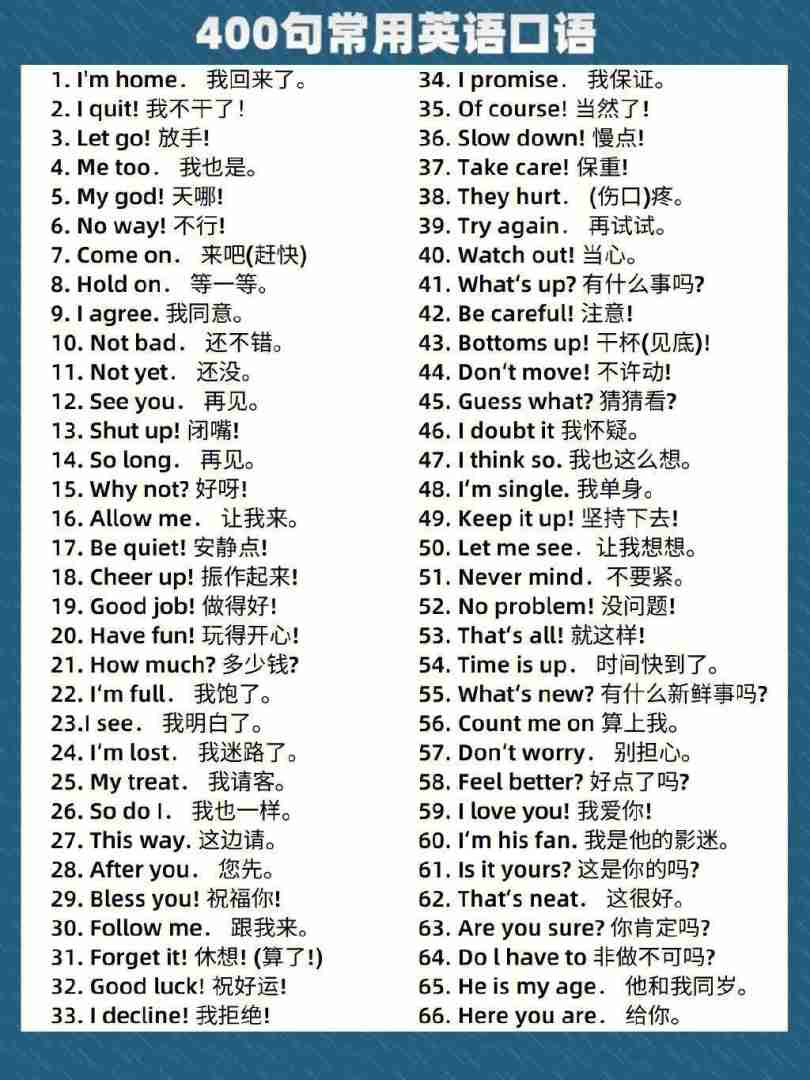 经典对话一男Can I buy you a drink?我可以为你买一杯饮料吗女Actually I’d rather have the money不必,我宁愿留下那些钱经典对话二男Can I have your name?直译我能有你的名字吗女Why? Don’t you already have one? 为什么你不是已经有一个了吗;随着现代社会的发展,无论是在求职还是在日常甲流中,现在人们越来越重视英语应用,以下是我为你整理了1分钟英语口语自我介绍范文,希望大家喜欢1分钟英语口语自我介绍范文篇1 Good morning teachers and classmates,i#39m glad to be here for selfintrodutionMy name is ** and i come from grade。