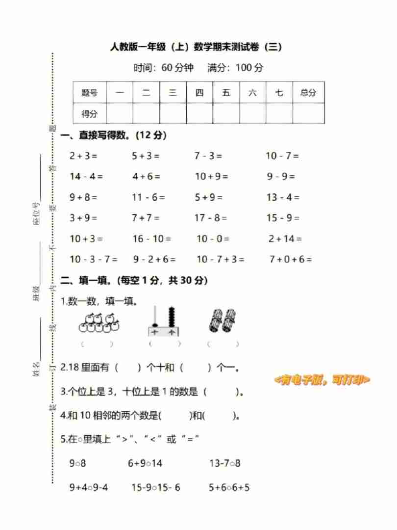 本文从网络收集而来,上传到平台为了帮到更多的人,如果您需要使用本文档,请点击下载,另外祝您生活愉快,工作顺利,万事如意最新部编版小学一年级上学期数学期中测试题及答案90分钟满分100分姓名班级分数一。
