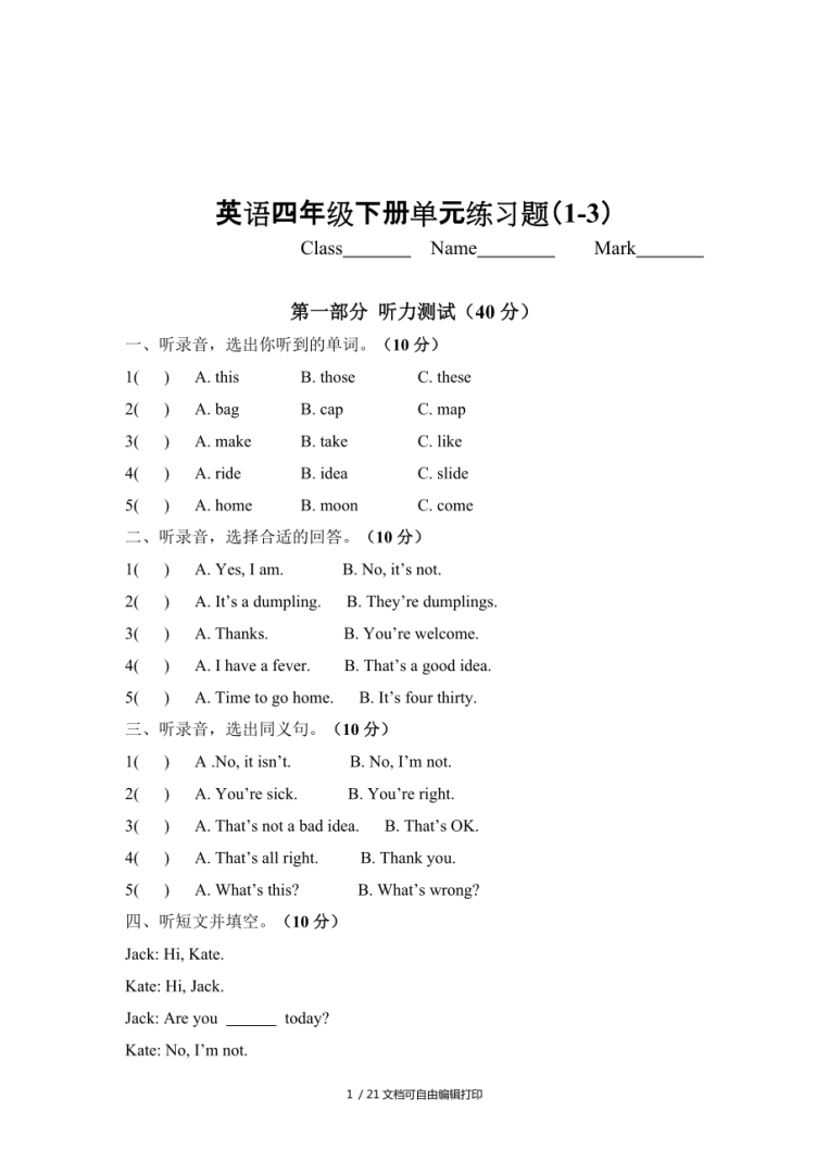 6、下面是我为大家整理的小学四年级上册英语期中试卷及答案,欢迎大家阅读更多相关内容请关注实用资料栏目小学四年级上册英语期中试卷及答案 听力部分40分一听句子,选择句子含有的信息,把其大写字母编号写在题前的括号。